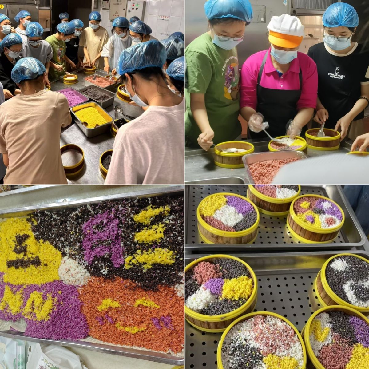 同日,在五合校区食堂,学校后勤处组织30余名伙食管理委员会的同学们开展了“青春三月三,五彩壮乡情”主题活动,在食堂阿姨的指导下,大家制作了兼具观赏和美味的五色糯米饭,让这个“三月三”色香味俱全。