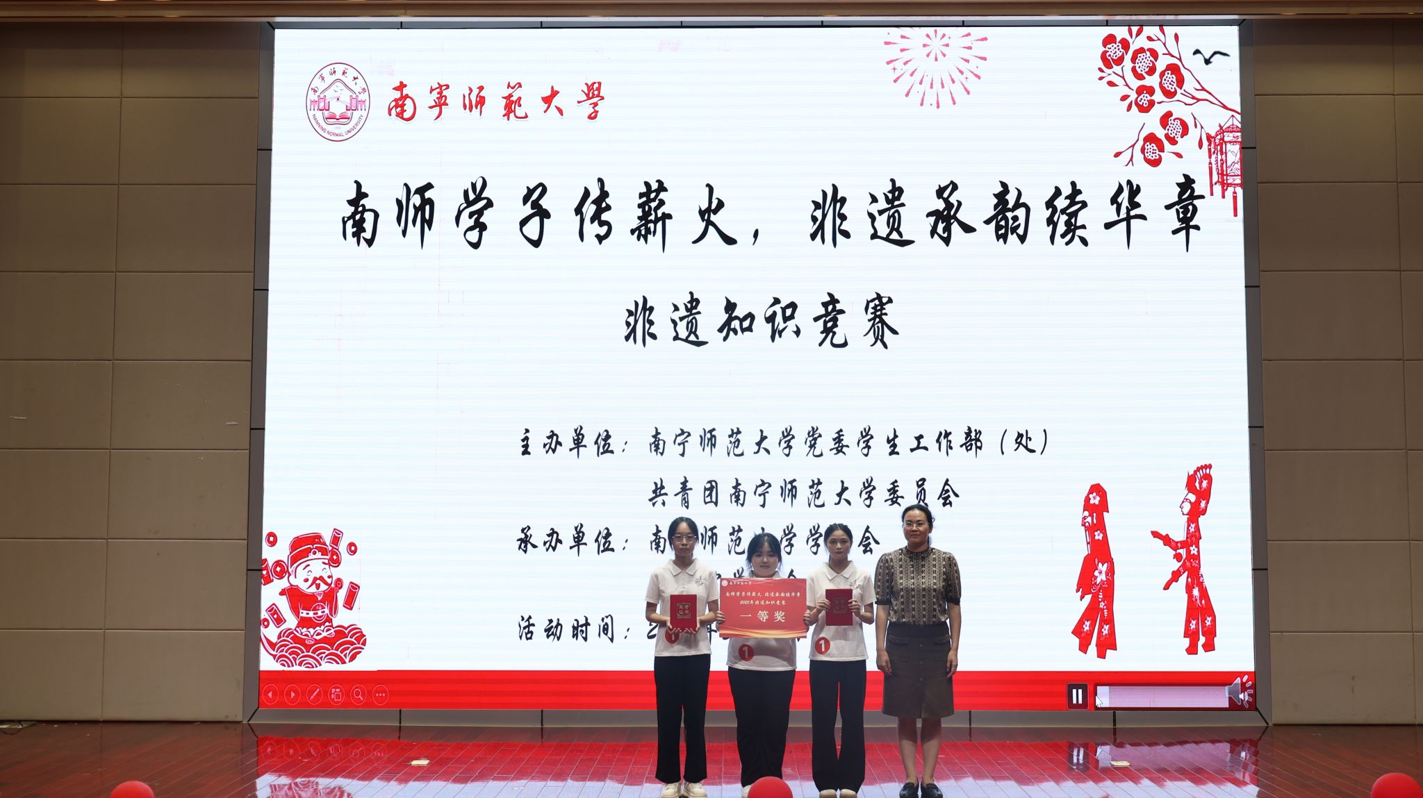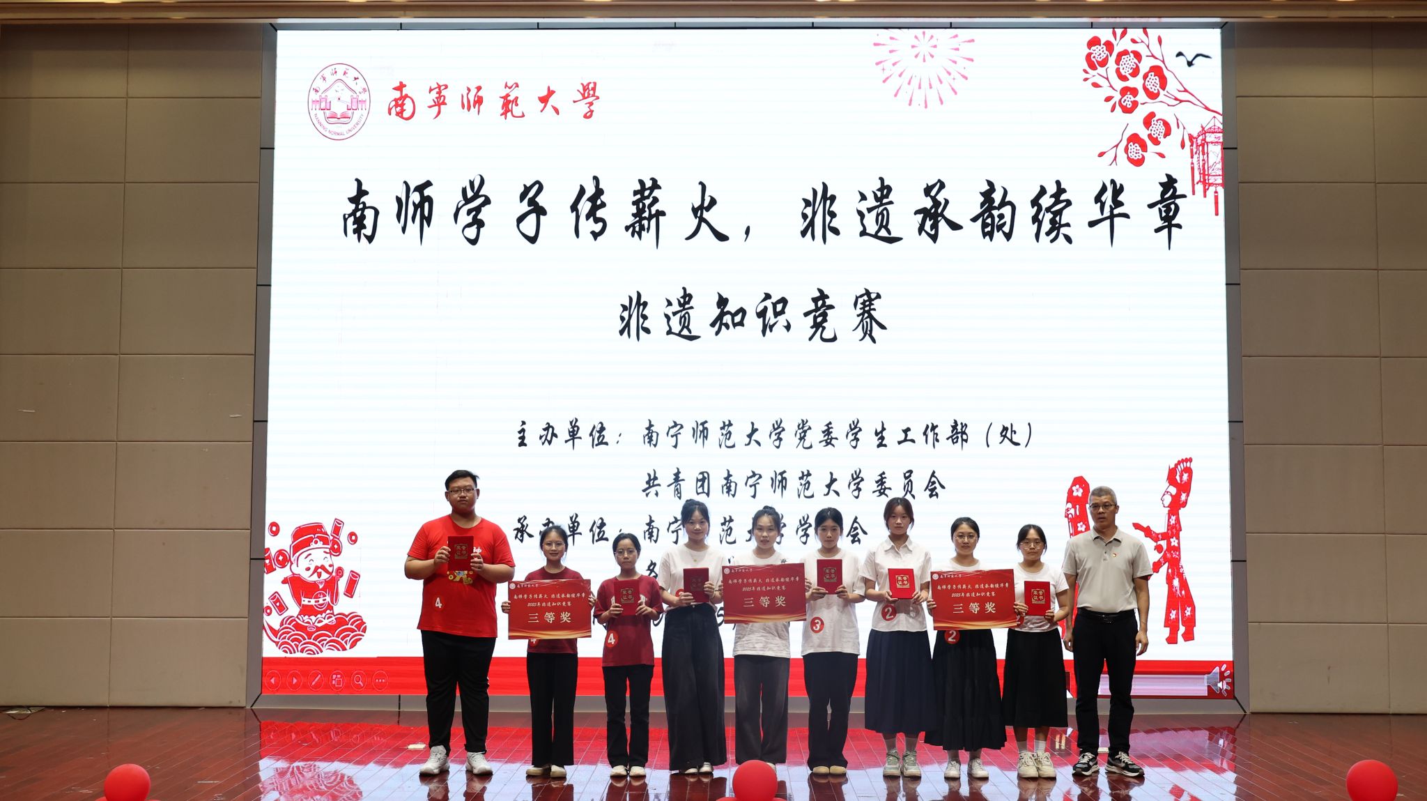 为进一步弘扬中华优秀传统文化,增强南师学子对非物质文化遗产的保护与传承,5月17日,bw必威西汉姆联在五合校区顺利举办“南师学子传薪火,非遗承韵续华章”非遗知识竞赛决赛,校团委书记区丽媛、学生工作部副部长何健、旅游与文化学院副教授方世巧担任评委。
