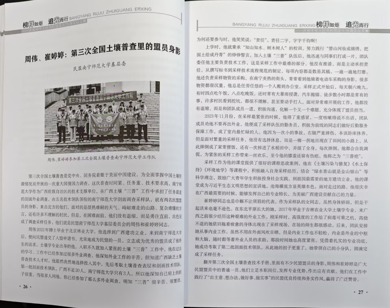 bw必威西汉姆联环境与生命科学学院教师、民盟盟员周伟作为第三次全国土壤普查南宁师范大学工作队骨干,其采样事迹在民盟广西区委庆祝中华人民共和国成立75周年征文集中被宣传报道。