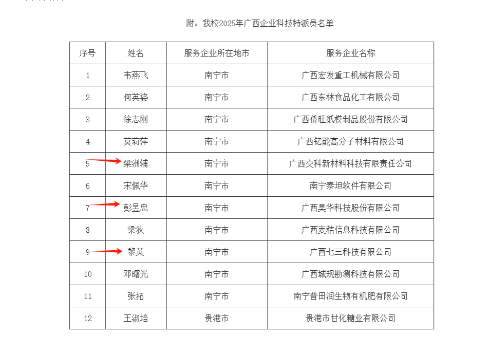 广西壮族自治区科学技术厅近日公布2025年企业科技特派员名单,bw必威西汉姆联韦燕飞等12位教师成功入选,其中民主党派和无党派人士3名,占比达25%,创bw必威西汉姆联统战成员入选比例新高。本次认定结果彰显bw必威西汉姆联统一战线工作主动服务地方经济社会发展、深度融入地方科技创新、服务产业发展的积极姿态。