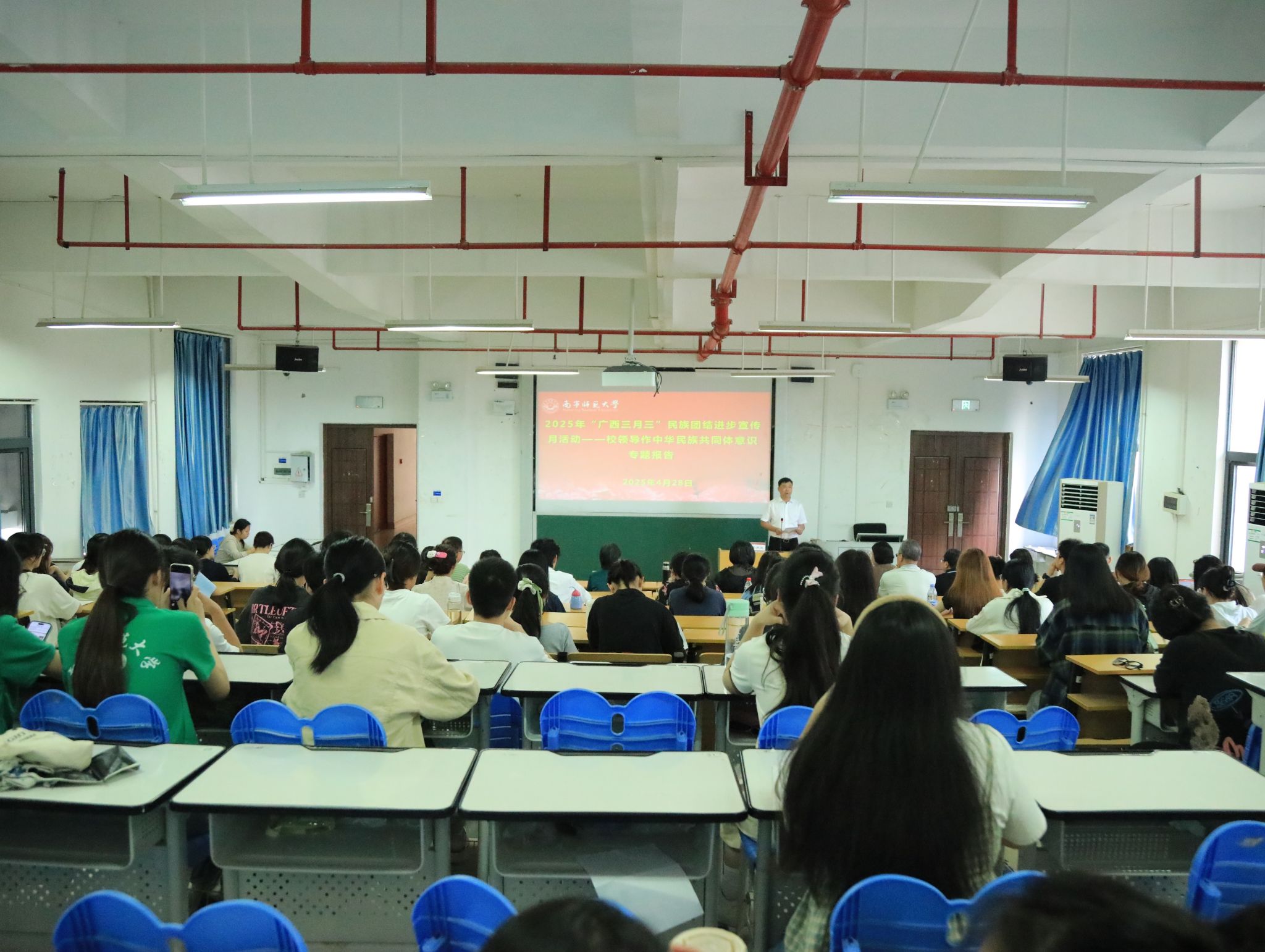 为深入贯彻落实国家及自治区关于加强民族团结教育的工作要求,4月28日下午,bw必威西汉姆联在五合校区举行铸牢中华民族共同体意识专题报告会。学校纪委书记李美清以《在八桂大地上谱写铸牢中华民族共同体意识的新篇章》为题作专题辅导。学校党委统战部部长、党办校办主任陈洪波主持报告会。